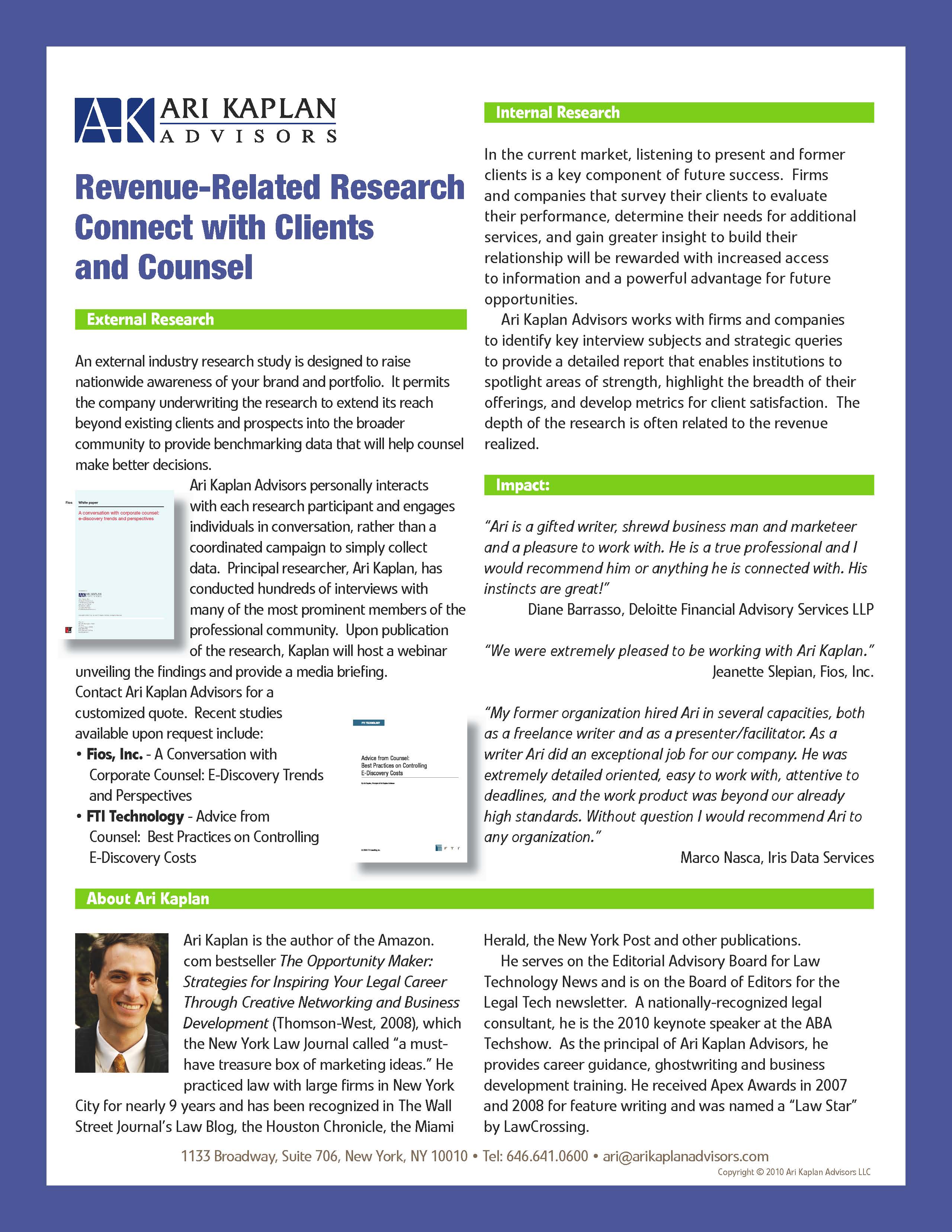 Ari Kaplan writes white papers, case studies, client profiles and articles for legal technology companies, as well as law-related client alerts and articles for law firms. His work has been published in: Law Technology News, Law Firm, Inc., Small Firm Business, The New York Law Journal, Wired, ComputerWorld, ComputerUser, eWeek, IP Law & Strategy, The National Law Journal, Law.com, Legal Tech newsletter, E-Discovery Law & Strategy, and many others.